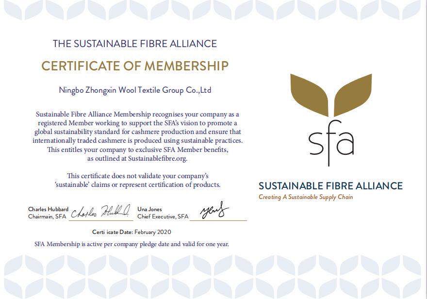 為推進羊絨產(chǎn)業(yè)綠色可持續(xù)發(fā)展,寧波中鑫經(jīng)過前期準備、申請和認證,于2020年2月20日正式加入了SFA(Sustainbale Fibre Alliance)組織。